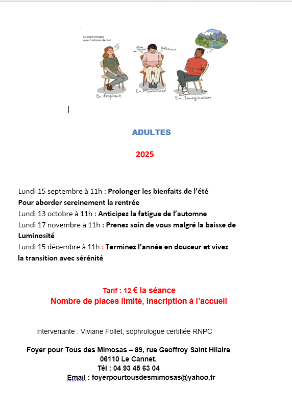 Horaires: Atelier de groupe (séances à thème) Le lundi de 11h00 à 12h00 Calendrier de septembre 2024 ci-dessus. Intervenante : Viviane Follet, sophrologue, formée à l'Institut de Formation Sophrologie de Paris